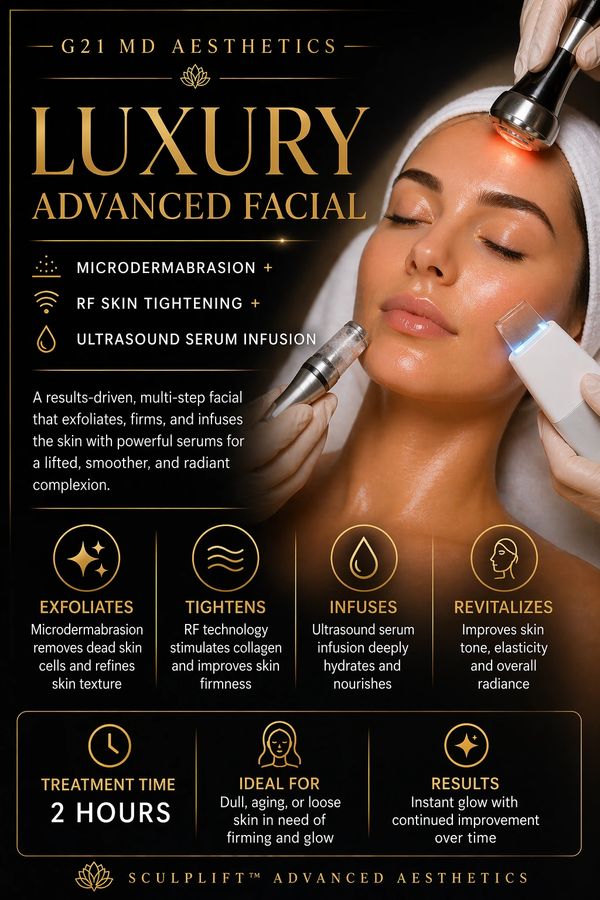 A multi-step lifting facial combining exfoliation, skin tightening, and deep serum infusion to firm, smooth, and revitalize the skin.